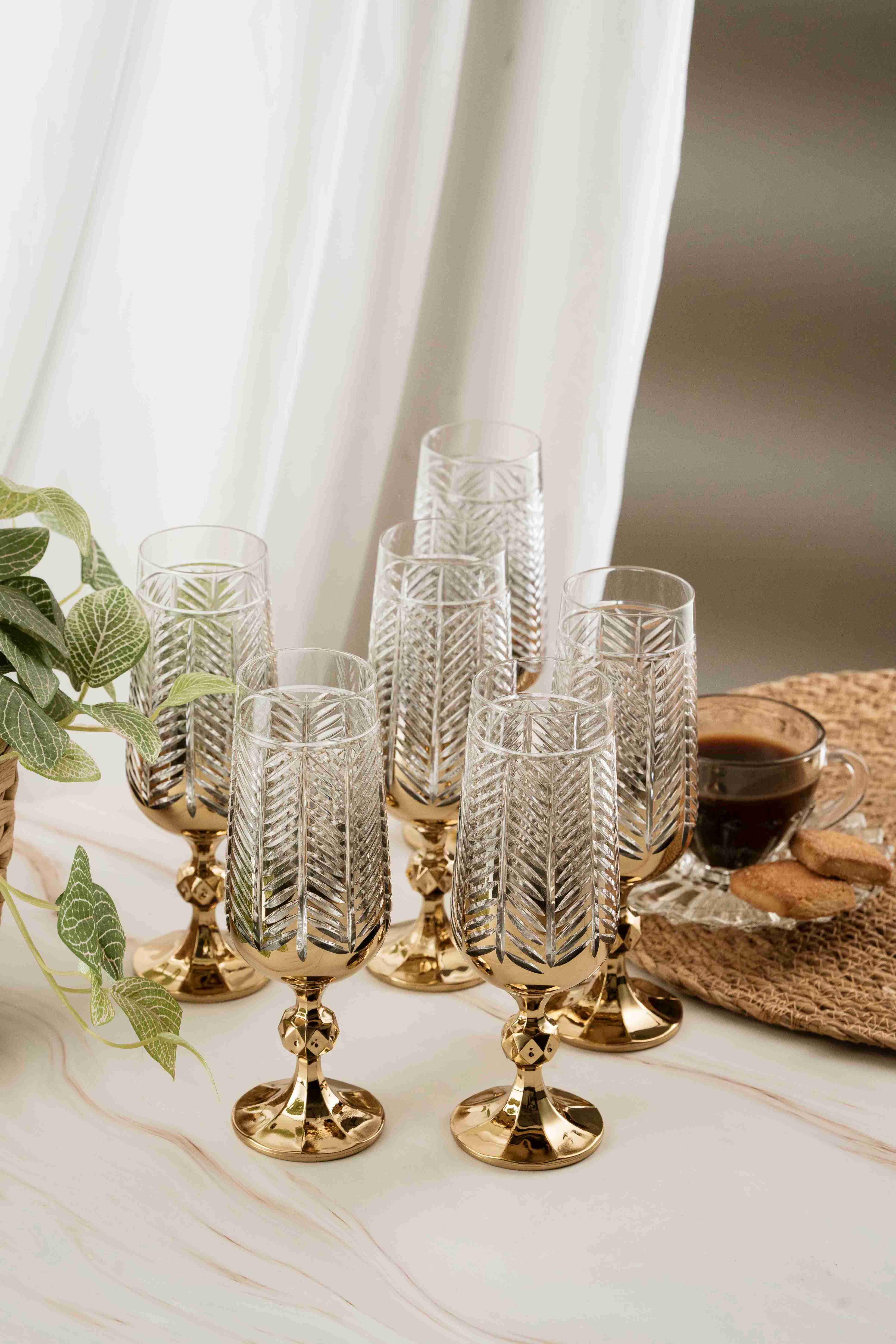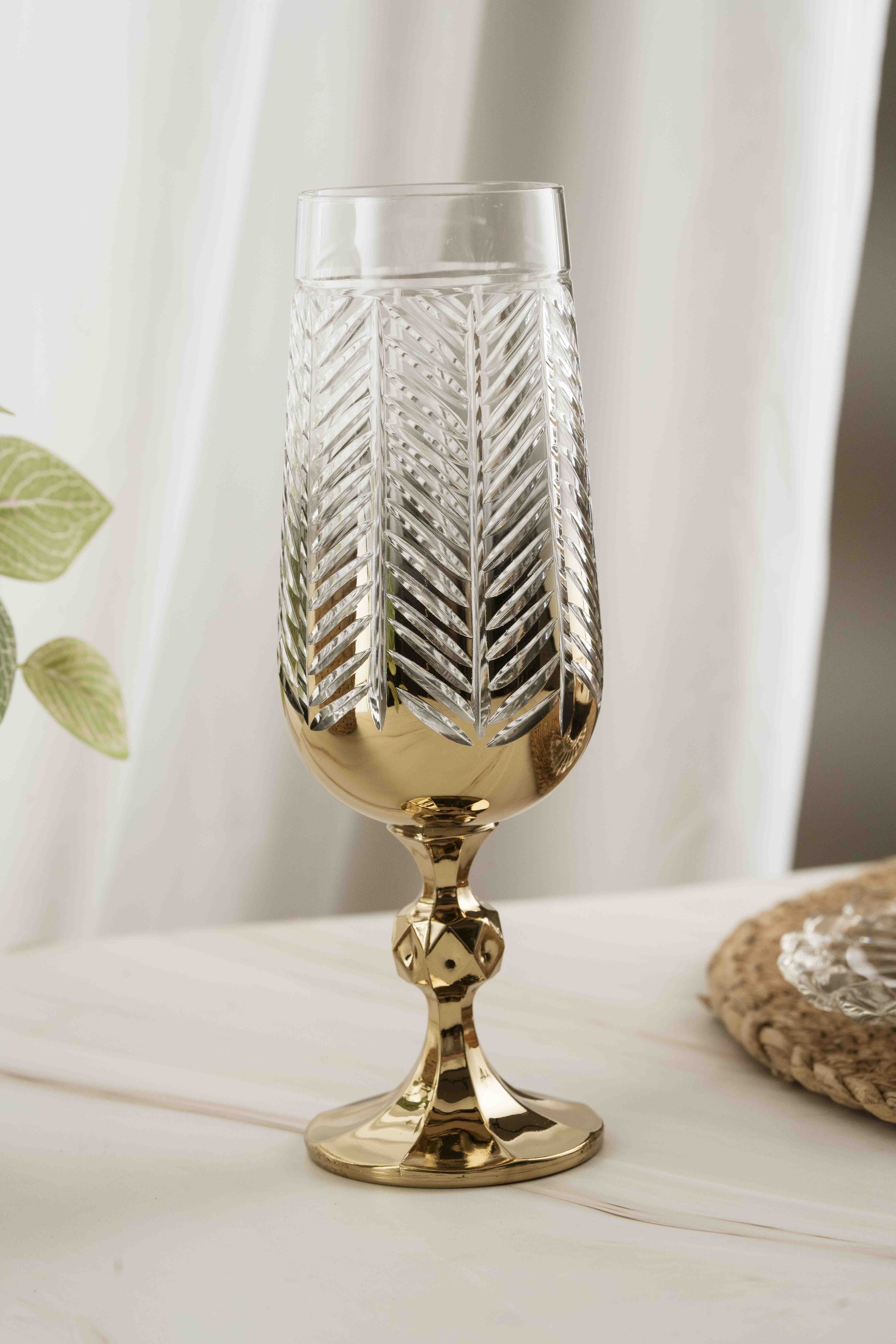 The Crystal Home Gold Goblet, with its elegant design and titanium gold finish, adds a sophisticated touch to your coffee and water presentations. With its 180 ml volume, this goblet is perfect for champagne, cocktails, soda, and other sparkling beverages, adding elegance to your tablescape with the sheen of crystal glass. Its high-quality glass is durable and long-lasting. The Crystal Home selection combines aesthetics and functionality, emphasizing elegance in every presentation.